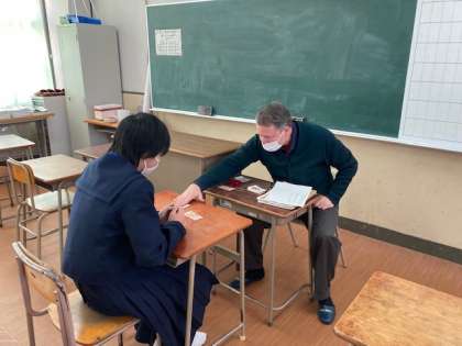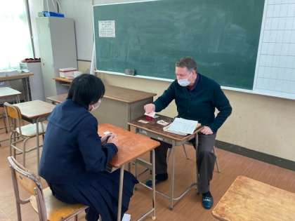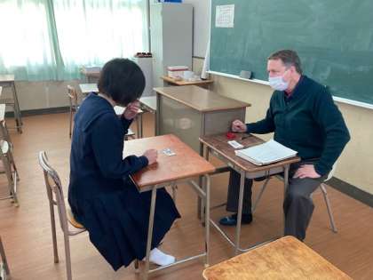 別室でC-NETのブラウン先生が、カードを使いなが会話のテストをしています。