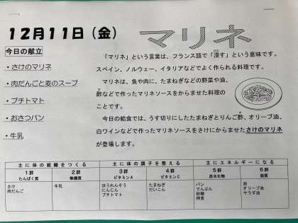 今日の給食では、うす切りにしたたまねぎとりんご酢、オリーブ油、白ワインなどで作ったマリネソースをさけにからませたさけのマリネが登場します。