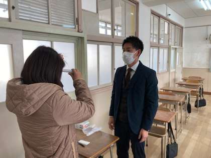 新型コロナウイルス感染拡大防止対策として、教室で消毒と検温をしていただいて懇談をお願いしています。