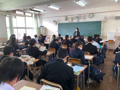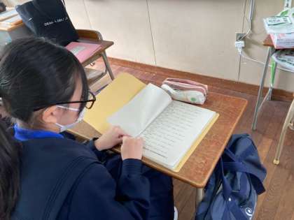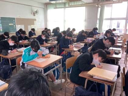 写真下段は、プリントが配られ、百人一首の小テストが始まりました。