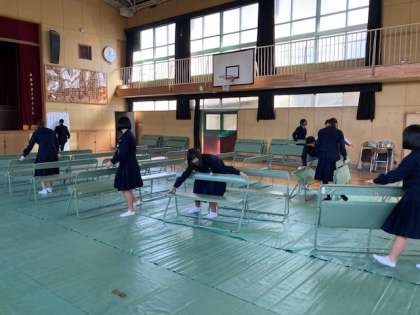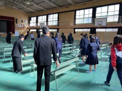 3年生が学年末テスト終了後、午後からの新入生保護者説明会に向けての会場準備をしてくれています。