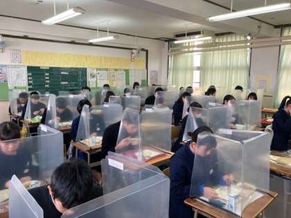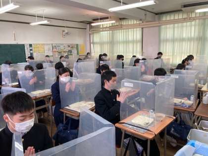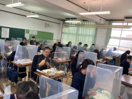 3年生は、本日より一人ひとりの机にシールドを設置して喫食しています。