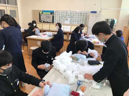 3年生家庭科の授業の様子です。 座布団枕の製作をしています。