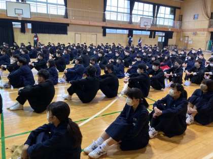 本日、3学年で行う最後の全校集会を実施しました。