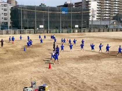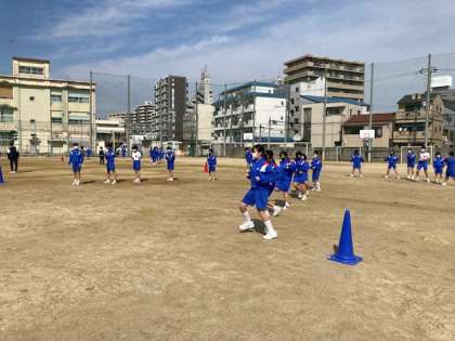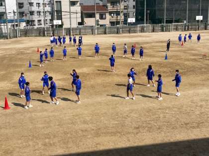 3年生が体育館で卒業式の練習をしているので、運動場でダンスの授業をしています。