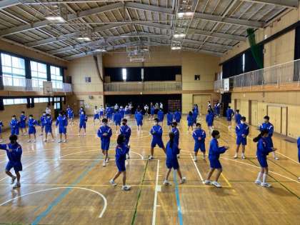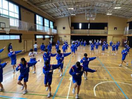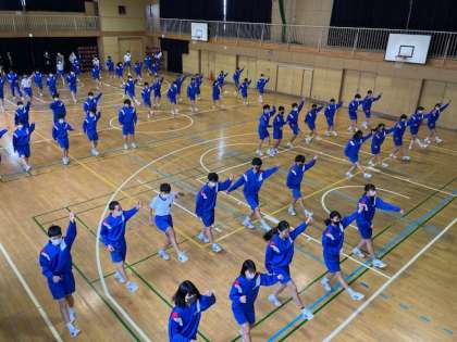 全体で動きや振り付けを確認しながら、ウォーミングアップをしています。