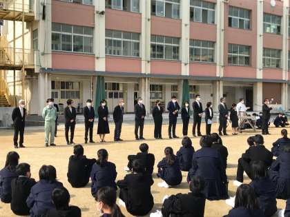 着任式では、新たに15人の教職員が三稜中学校に着任し、挨拶がありました。