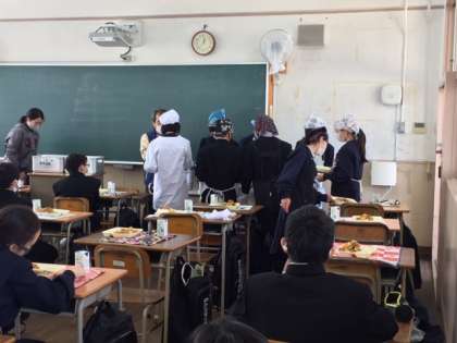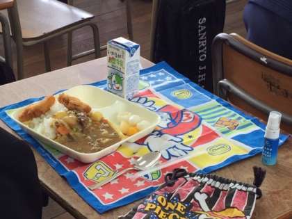 新学期最初の給食です。メニューは、カツカレーライスとフルーツ白玉です。当番の人か配膳し、みんなで「いただきます!」