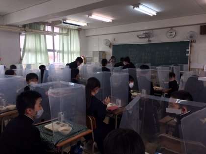 感染対策をしての喫食です。喫食後は、アクリル板をはずし、速やかにマスクを着用します。