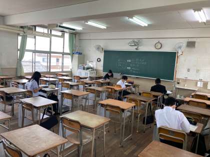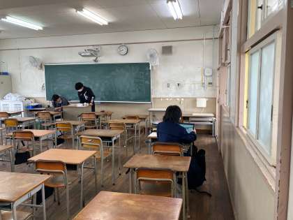 登校してきた生徒は課題を黙々とこなし、中にはパソコンを使って理科の問題に取り組んでいる生徒もいました。