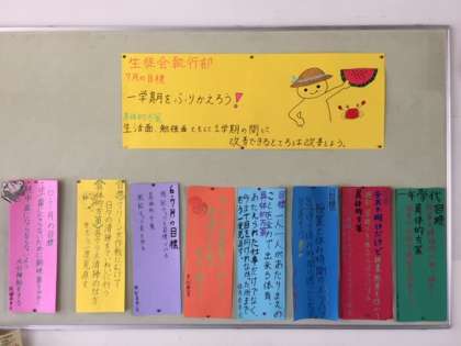 生徒会各委員会で決めた目標です。玄関入って左手のところに掲示しています。