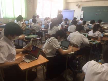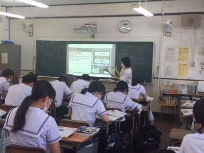 英語・音楽・社会の授業の様子です。今日も気温が高くなりそうです。エアコンを使って冷房しながら、換気にも気をつけて授業を進めています。