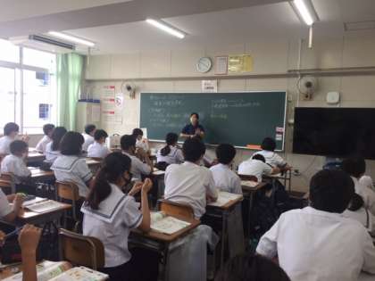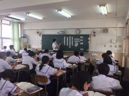 教育実習生による授業の様子です。教育実習生は三稜中学校の卒業生です。母校での教育実習のなかで学習指導、生徒指導など教育活動全般について学んでいます。