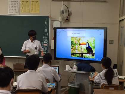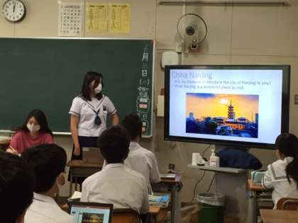 緊張しながらも、おすすめの場所や食べ物、文化など、画像を使い、相手に伝わるように工夫して発表しています。