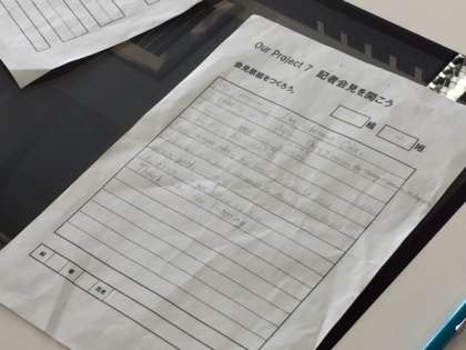 3年生の英語の授業です。「記者会見を開こう」というテーマで原稿をつくりました。