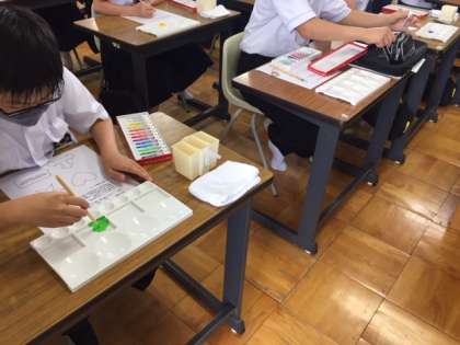 美術の授業です。平塗りの練習をしています。静かに集中して塗っています。