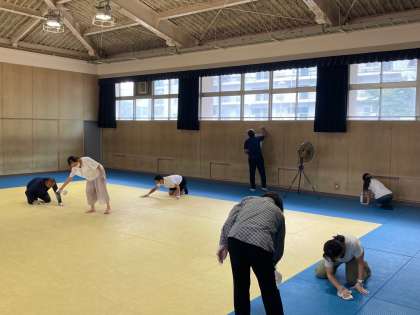 生徒下校後、手分けをして教室をはじめ特別教室の消毒作業を行っております。(写真は格技室)