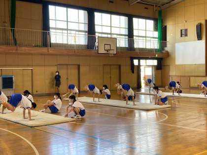 前後転、開脚前転、側転(写真)の練習でした。次回は倒立前転に挑戦です。