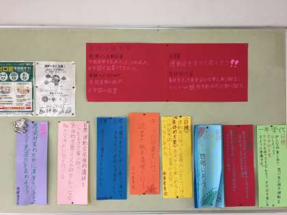 生徒会各種委員会で決めた10月の目標、生徒会執行部の前期の活動反省、後期への引継ぎを玄関前に掲示しています。登下校時に確認してみましょう。