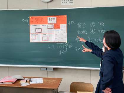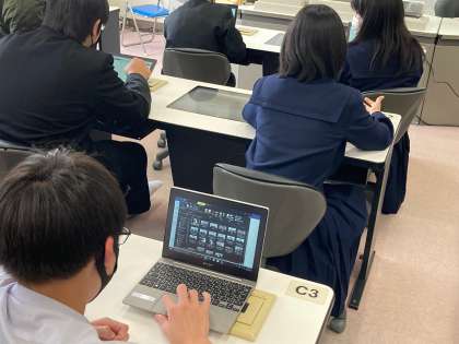 タブレットで撮った写真を選び、壁新聞を作成しています。