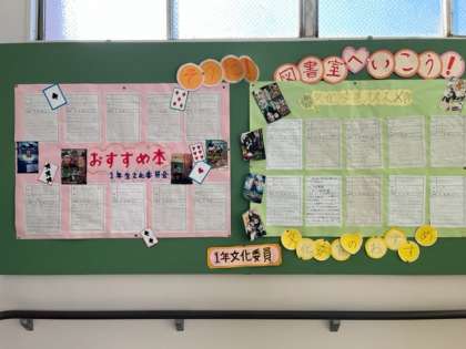 各学年の文化委員が「おすすめ本」を紹介しています。この本、面白そうだな、興味があるなぁと思った人は図書室へ。