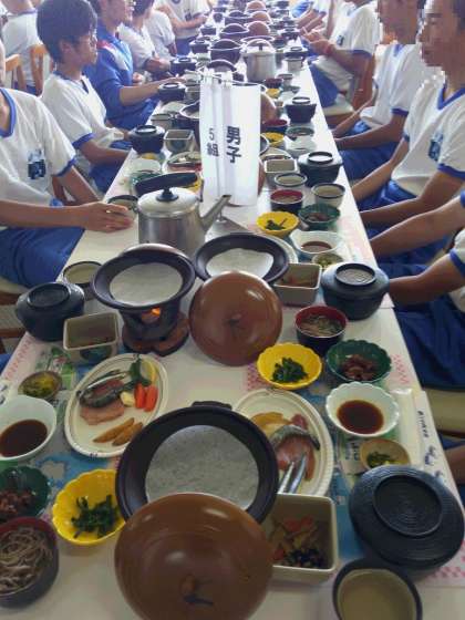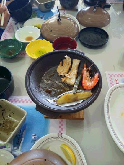 昼食のメニューは本マグロのステーキと大きなエビでした。