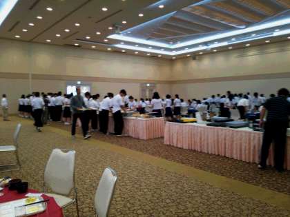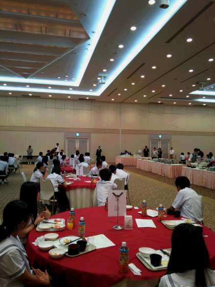 生徒は、豪華な朝食会場に少し緊張していますが、皆元気です。