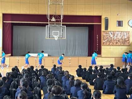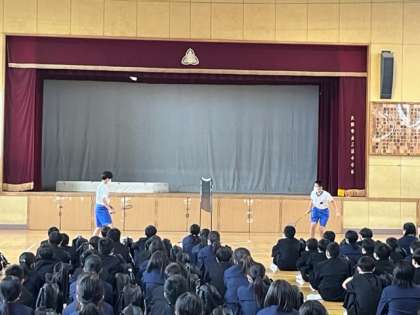 1年生対象に「部活動紹介」を行いました。キャプテン・部長を中心に各部の練習風景などを交えながら、紹介をしました。放課後は、部活動見学を実施しています。三稜中学校には、「野球」「サッカー」「陸上競技」「バドミントン」「バスケットボール」「ソフトテニス」「読書」「茶道」「美術」「家庭科」「吹奏楽」の部活動があります。