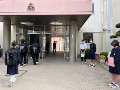 「おはようございます」さわやかな声がごだまします。風紀委員を中心に「あいさつ運動」をしています。明るい笑顔でアイコンタクトを心がけましょう。