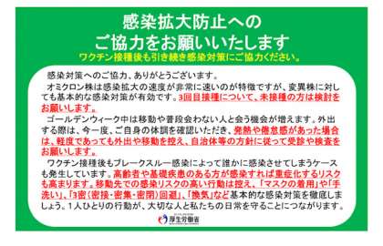 知らないうちに感染を拡大させないためにも、「マスクの着用」・「マスクをしていても近距離でしゃべらない」・「3密回避(密接・密集・密閉)」・「手洗い」・「換気」などの基本的な対策を徹底しましょう。