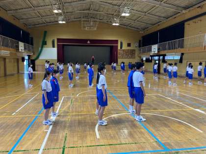 4限目、2年生1、2組の体育です。集団行動、整列練習です。回を重ねるごとに複雑になっています。班で一人ひとりが考えながら、工夫して頑張っていました。