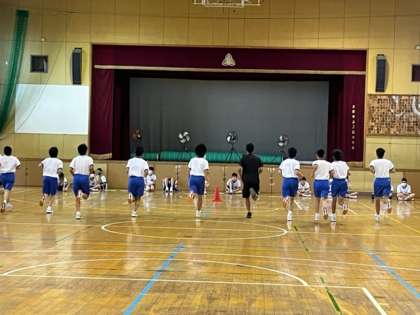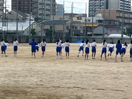 女子は、陸上競技のクラウチングスタートの練習をしています。男子は、スポーツテストのひとつであるシャトルランを実施しています。