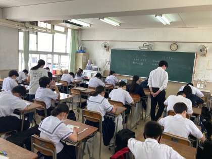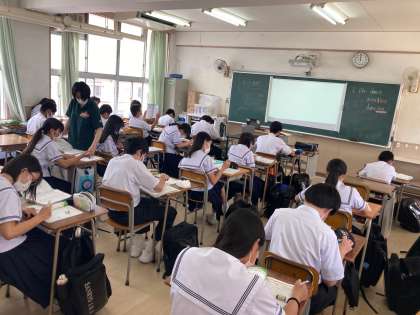 写真上は理科Aで化学反応式の小テスト、写真下は動名詞を使った文を作成していました。