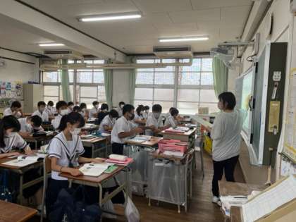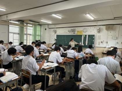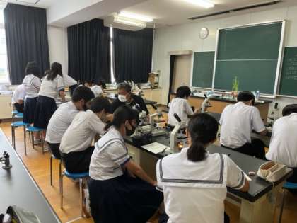 3年生、国語・英語・理科の授業の様子です。理科は、顕微鏡を使い、細胞分裂の観察をしています。