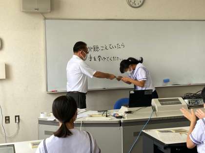 まず、陸上競技部の表彰からです。次に校長先生から夏至のこと、時間を有効に使いましょうと話がありました。