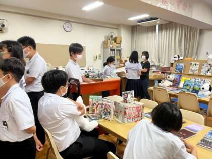 今日は蒸し暑い雨の日になっています。昼休みの図書館には、いつもより多くの生徒が来館しています。本の貸し出し・返却は、文化委員がバーコードの読み取りを使って行っています。