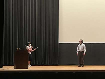 平和登校日として「平和」について考える取り組みを実施しました。ゲストティーチャーの方に、「大阪大空襲」のことや「戦争体験者の方の声」、東住吉区田辺に落とされた「模擬原爆」のことなど、映像を用いて、わかりやすく話をしていただきました。