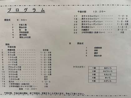 プログラムを載せておきます。出場種目・クラスカラーを確認しましょう。