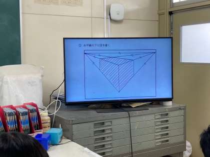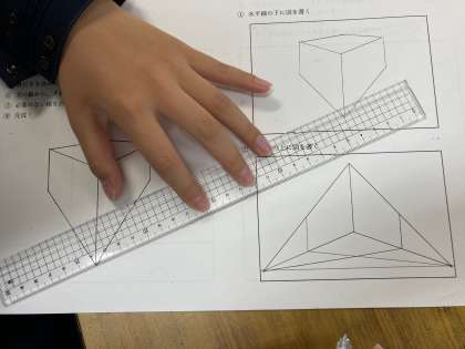 ピクトグラムが終わり、新しい単元、2点透視図法に入りました。1学期に学習した1点透視図法よりもかなり複雑で難解な図法です。