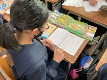 先週に引き続き、ORTの絵本を読み進め、多読日記に読んだ絵本の語数を記入しています。だんだんと読むスピードも速くなり、累計語数2,000語を突破する生徒も増えてきました。