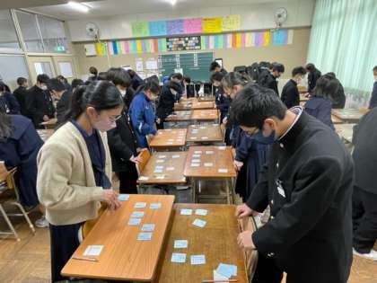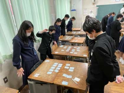 今日から、今月27日に行われる百人一首大会に向けての取組みが始まりました。各クラスともそれぞれ大会本番に向けて、上の句・下の句を覚えたり、先生が読み上げる札を取り合うなど一生懸命に取組んでいました。