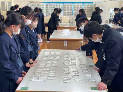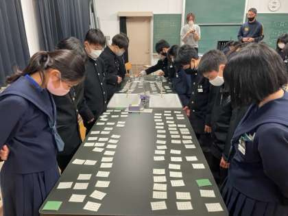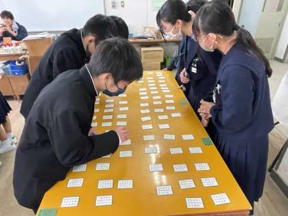 1年生の百人一首大会は来週行われます。今日は各クラスともそれぞれ本番さながらの練習をしました。みんな和気あいあいと楽しく札を取り合って、そのたびに大きな歓声があがっていました。来週の大会が楽しみです。