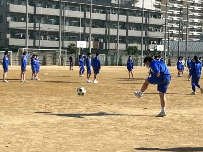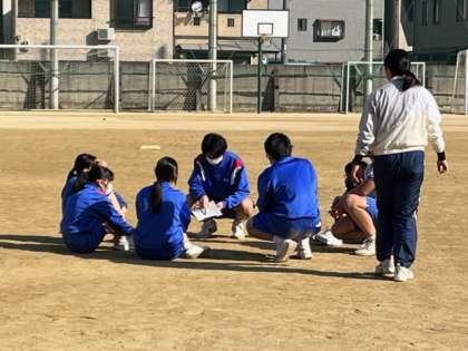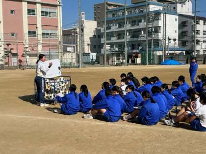 キックベースボールの授業です。男女混合のチームで話し合い、打順や守備、戦術を考えて練習を行いました。