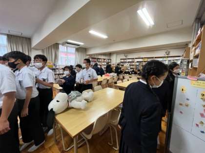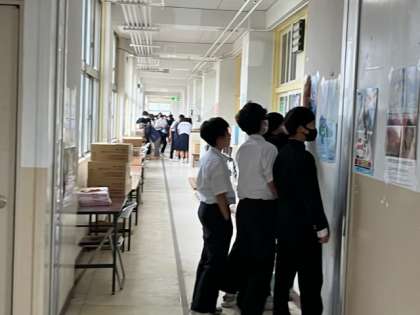 給食が終わり、昼休みです。今日は、天候が悪く運動場が使えません。図書室には、多くの生徒が来て本の貸し出しを行っています。