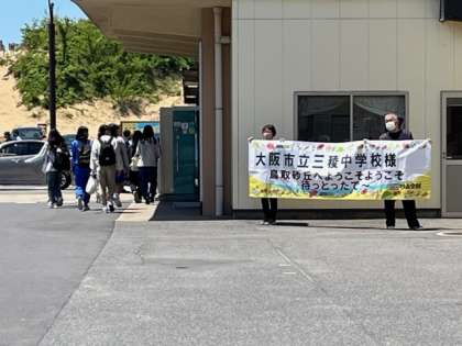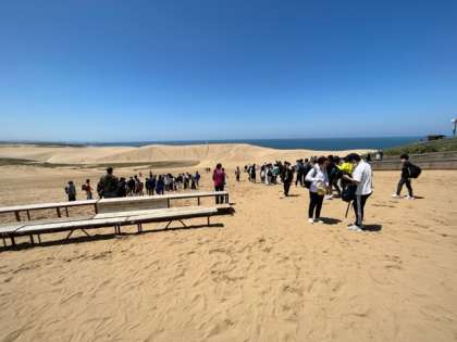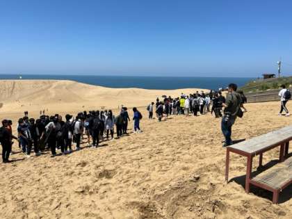 鳥取砂丘に到着しました。天気は、晴れ。クラス写真を撮ります。