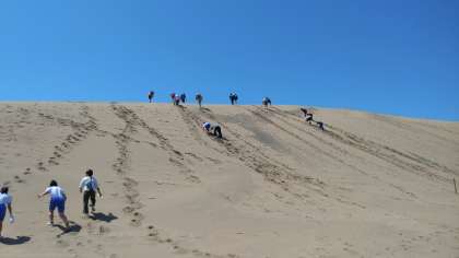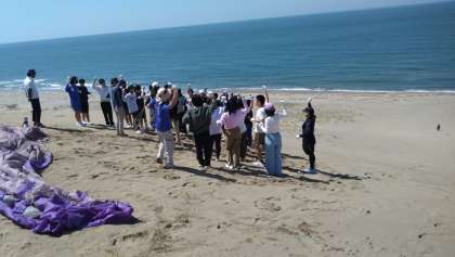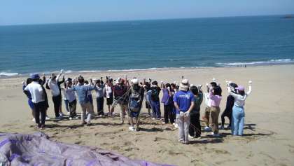 今最高の風が吹いてて飛ぶためのレクチャーをインストラクターの方から受けています。