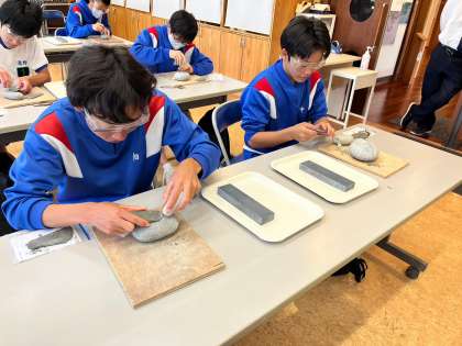 弥生時代の遺跡がある、むきばんだ史跡公園で、石包丁を作っています。