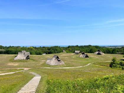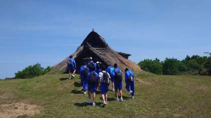 むきばんだ遺跡の竪穴式住居を見学中です。