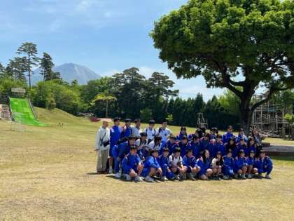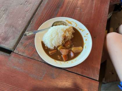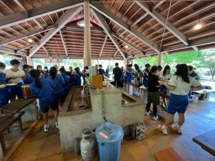 大山をバックにクラス写真を撮ったあと、昼食です。昼食は、セルフスタイルでのカレーライスです。クラスごとにいただきます。
