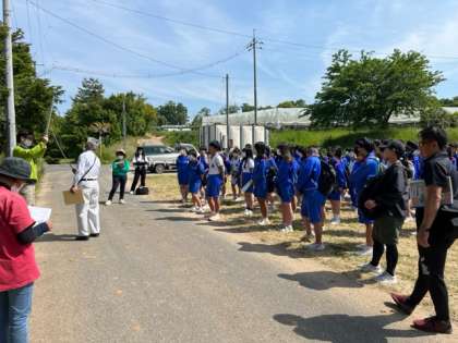 梨の袋がけ作業を体験しています。